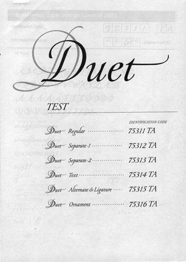 Pirouette won 1st prize in the display category of the International Type Design Contest held by Linotype in 2003, and was released for sale the next year in 2004. 2006 saw the sales release of Pirouette Com Regular, a new version equipped with OpenType functionality.
